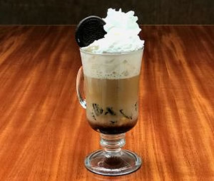Em uma taça bill (taça para café ou similar) coloque 2 bolachas quebradas, adicione a calda, coloque o leite vaporizado e o espresso no centro, para que fique trifásico. Coloque um caracol de chantilly e decore com uma bolacha.