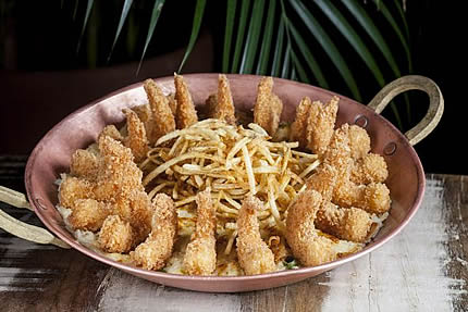 Três dos pratos trazem o camarão, crustáceo que dá nome à marca, como o grande protagonista das receitas. Assim, para começar, o "Gratinado Costa Verde", que apresenta camarões refogados com cebola roxa, alho, tomate, cebolinha e molho apimentado, tudo isso gratinado com queijo coalho sobre o clássico arroz camarada. Para finalizar, batata palha. "A inspiração para esta receita, surgiu em Salvador. Daí a inserção da pimenta e de outros ingredientes tão nordestinos ao lado do camarão", explica François.