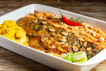 Já o Pargo ao molho de alcaparras, com filé grelhado e regado com azeite, alcaparras, champignon e salsa, acompanha legumes salteados, tomates assados e arroz com brócolis.