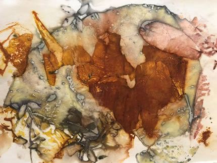 Já a série "Quarentena de Gaia" é composta por pequenos quadros impressos em Eco-print, uma técnica nova, na qual as próprias flores e folhas emprestam suas cores e formas ao papel aquarela. Esses pequenos quadros ficarão presos à parede da maneira convencional e contarão com um audiovisual explicativo do seu significado e processo criativo.