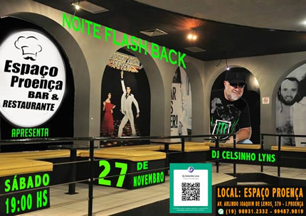 As melhores musicas dos anos 70, 80, 90 e 2000, no FLASH BACK do DJ CELSINHO LINS, que vai acontecer neste proximo sábado, dia 27/11 a partir das 19 horas, no ESPAÇO PROENÇA BAR e RESTAURANTE - Av. Arlindo Joaquim de Lemos, 379 - Jd. Proença