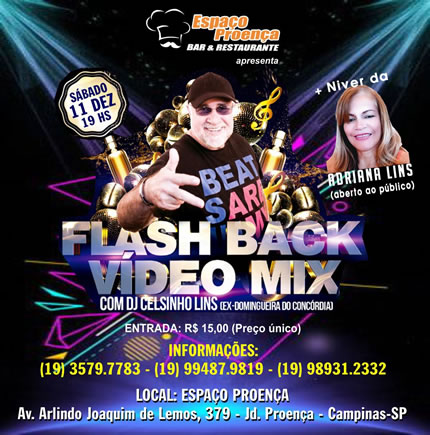 Sábado, dia 11/12, o último FLASH BACK do DJ CELSINHO LINS do ano de 2021 no ESPAÇO PROENÇA a partir das 19hs. Entrada: R$ 15,00. Reserve sua mesa, é gratuita. É só ligar (19) 98931.2332 ou 99487.9819. Vai ter o niver da Adriana Lins (aberto ao público). Curtam as melhores músicas originais dos anos 70, 80, 90 e 2000 no telão. Som e luz de primeira.