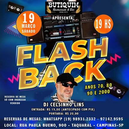 Flash Back do dia 19/03 no Butiquim - Rua Paula Bueno, 900, Taquaral. Dj Celsinho Lins. Já adquiriram ingressos? Se ainda não, pode pegar comigo por aqui através do pix. Minha chave: CPF/555.223.278-04. Me enviem o comprovante por aqui, envio pra voce a foto do ingresso e depois ja faço a reserva da mesa ok? Os ingresso poderão retirar na portaria do BUTIQUIM MBAR & CIA, no dia do evento, sábado, blz? - Antecipados - R$ 15,00 - No dia na portaria: R$ 20,00. Últimos ingressos e mesas.