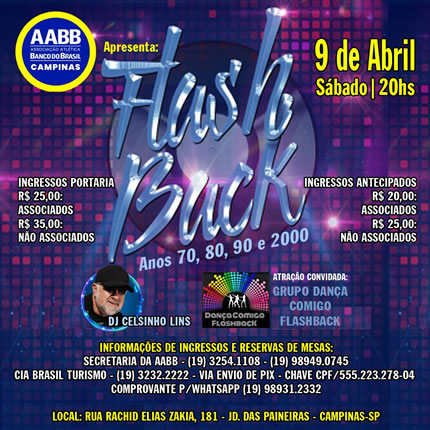 Dj Celsinho Lins, convida você para a sensacional Noite de FLASH BACK na AABB - Associação Atlética Banco do Brasil - Rua Rachid Elias Zakia, 181 - Jd. das Paineiras - Campinas, neste próximo sábado, dia 09 de Abril, a partir das 20hs. Ingressos se esgotando mas ainda dá tempo de garantir o seu. Adquira através de envio de PIX na minha chave: CPF/555.223.278-04: Sócios: R$ 20,00 antecipado e Não sócios: R$ 25,00 antecipado e na portaria Sócios: R$ 25,00 e Não Sócios: R$ 35,00. Envie o comprovante no WhatsApp (19) 98931.2332 e depois enviamos a foto do(s) ingresso(s) e aí podem reservar a mesa. Os ingressos poderão ser retirados na portaria da AABB-Campinas, no dia do evento.