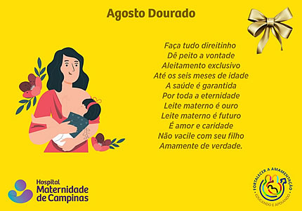 O Hospital Maternidade de Campinas (HMC) preparou uma série de ações para chamar a atenção sobre a importância do aleitamento e da doação do leite materno no “Agosto Dourado”, mês escolhido pela Organização Mundial de Saúde para simbolizar a luta pelo incentivo à amamentação. A maior parte das ações serão realizadas na Semana Mundial de Amamentação, que acontece entre os dias 1º e 7 de agosto. Este ano a fachada do hospital terá decoração comemorativa e serão realizadas apresentações musicais, além de orientação para as mães internadas. O HMC também será beneficiado com a realização de uma campanha feita pelo Parque Dom Pedro Shopping para a arrecadação de frascos, usados para a coleta das doações do leite materno.