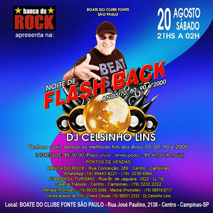 Ingressos com vendas aceleradas. Não fique de fora de mais uma noite incrível de FLASH BACK da Boate do Clube Fonte São Paulo com o DJ CELSINHO LINS, que acontecerá dia 20/08 a partir das 21hs e vai até as 02hs. Ingressos antecipados: R$ 30,00 (preço único). Pode adquirir por aqui através de envio de pix para a chave: CELULAR / 19 98931.2332. Após a transferência, envia o comprovante no WhatsApp (19) 98931.2332 e será enviado pra você a foto dos ingressos. Poderá retirá-los na portaria do Clube no dia do evento. Após o pagamento, marcamos sua mesa. É gratuita. Endereço do Clube: Rua José Paulino, 2138 - Vila Itapura (Perto da Maternidade de Campinas e atrás da antiga fabrica Chapéus Vicente Cury)