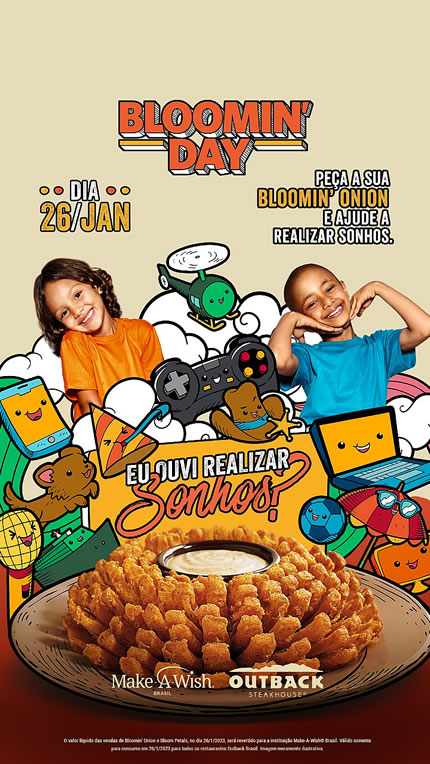Neste 26 de janeiro, quinta-feira, ao adquirir uma Bloomin’ Onion nas unidades físicas do restaurante de temática australiana ou a Bloom’ Petals pelo delivery, o consumidor pode colaborar para essa causa e ajudar a transformar os sonhos dos pequenos em realidade.