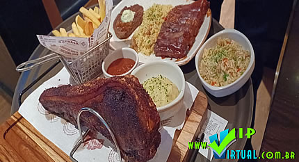 Tomahawk Fried Pork é uma surpreendente carne de porco nobre, com aproximadamente 800 g de muito sabor. Marinado, assado e pururucado, o prato é servido com molho barbecue de goiabada e dois acompanhamentos à escolha do cliente. O corte oferece a medida certa de carne com camada de gordura, além de apresentar diferentes texturas, como a maciez do corte e a crocância da pururuca.