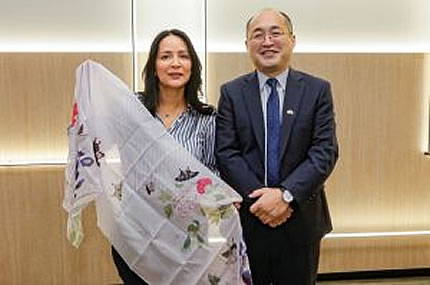 Primeira-dama Cristiane Freitas recebe echarpe típica coreana das mãos do cônsul-geral da República da Coreia do Sul, Insang Hwang Cristiane Freitas, primeira-dama do estado de São Paulo e representantes da ABIV