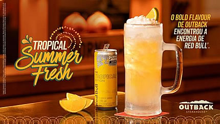 Seguindo essa tendência, o Bold Flavour do Outback se uniu à energia da Red Bull para uma super novidade: a partir de 29 de janeiro, clientes poderão saborear o lançamento Tropical Summer Fresh (R$ 29,90), mocktail que eleva os níveis de energia com uma combinação de Red Bull Tropical com um toque de limão, gengibre, mix de xaropes e espuma de limão. A opção está disponível exclusivamente nos restaurantes físicos do Outback em todo o Brasil.
