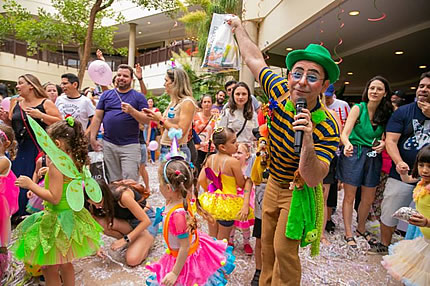 No sábado (10), quem for ao local se deparará com uma oficina de máscaras, um desfile de fantasia infantil, um show mirim da cantora Alê Carmani, um bailinho de carnaval e uma oficina de instrumentos musicais. Já no domingo, também nos dois primeiros andares, o shopping sedia uma oficina de adereços de carnaval, um desfile de fantasia de pets, um karaokê infantil, mais um bailinho de carnaval e uma oficina de lança confetes.