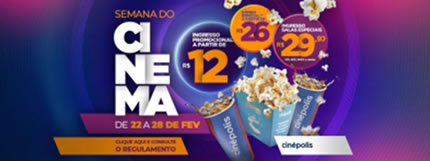 Para celebrar a magia do cinema nas telonas, a Cinépolis e o Galleria Shopping se unem a mais uma edição da "Semana do Cinema", que acontece em todo o país de 22 a 28 de fevereiro. Durante esse período, os ingressos serão disponibilizados com preço a partir de R$ 12,00 e os combos de pipoca e bebida terão valores especiais.