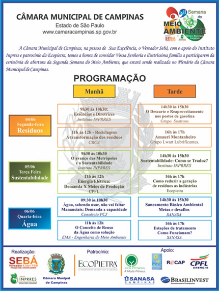 A Câmara Municipal na pessoa do Sr. Vereador Sebá Torres com apoio do Instituto Impress e patrocinio da Ecopietra realizam nesta data a abertura da Semana do Meio Ambiente com inumeros debates no decorrer da semana.