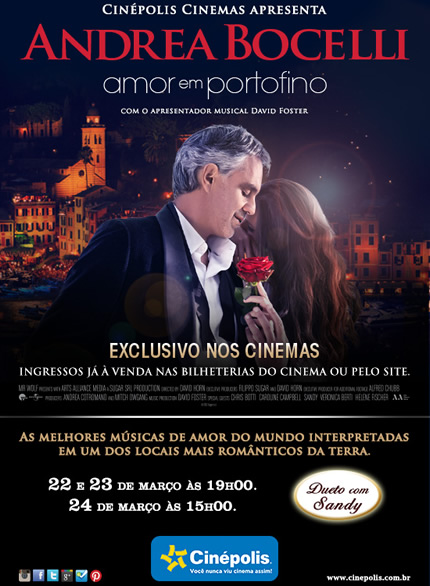 Uma das maiores vozes da música clássica mundial estará no cinema do Campinas Shopping. Nos dias 22, 23 e 24 de março, o Cinépolis exibe o inesquecível show Andrea Bocelli: Amor em Portofino. Realizado num dos lugares mais românticos e inspiradores do mundo, Bocelli interpreta músicas marcantes de sua carreira, acompanhado de Caroline Campbell no violino, Chris Botti no trompete e uma orquestra de 40 músicos. O cantor também recebe convidados especiais, como a cantora brasileira Sandy.