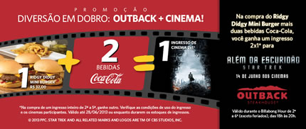 A tradicional combinação Outback + Cinema ficou ainda melhor. Uma promoção e um concurso cultural presenteiam os clientes com cupons para ingressos grátis e prêmios exclusivos do novo filme Além da Escuridão: Star Trek, lançado no dia 14 de junho. Em Campinas, as parcerias são com os cinemas Cinemark (Iguatemi Campinas), Cineflix Galleria (Galleria Shopping), Box Cinepolis (Campinas Shopping), Moviecom (Shopping Unimart) e Kinoplex (Shopping Parque D. Pedro). Os ingressos valem para qualquer sessão de segunda a quinta-feira, exceto feriados, com exceção das salas Premium e XD.