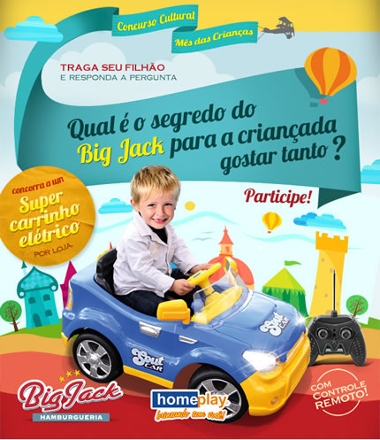 Com a diversão e a alimentação garantidas, os pais entram em ação! Para deixar a data mais especial, o Big Jack repete o sucesso e em parceria com a Home Play irá sortear três carros elétricos do modelo “Sout Car”, que funcionam com bateria recarregável. Desenvolvido para crianças com idade entre 3 e 5 anos, o carrinho acende os faróis, emite sons de motor e buzina, pode ser controlado internamente pela criança ou através de rádio controle remoto pelos pais: diversão na certa para os pequenos pilotos!