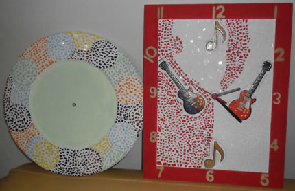 Sandra Racy produz peças reutilizando materiais como madeiras, azulejos, pastilhas de vidro, bolas de gude, espelhos e pedras e com a preocupação de que as obras sejam também funcionais, confecciona relógios, tampos de mesas, cadeiras, espelhos, bandejas, quadros e cenários para áreas de luz.
