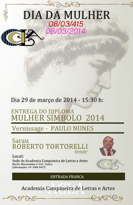 Academia Campineira de Letras e Artes, no dia 29 de Março de 2014 realiza a entrega do diploma "Mulher Símbolo 2014"