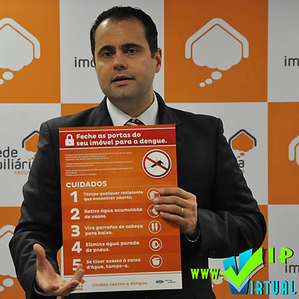 O presidente da Rede Imobiliária Campinas, Rodrigo Coelho de Souza, acompanhado dos seus diretores, Neiva Pivetta e Carlos Francisco Valverde, apresentou para a Imprensa, nesta quarta (9 de abril) às 11 horas, a campanha da entidade contra a dengue, direcionada para as suas empresas associadas e clientes. A ideia da campanha surgiu de uma solicitação do prefeito de Campinas, Jonas Donizette, para que as imobiliárias da cidade ajudassem no combate a dengue. Imediatamente a diretoria da Rede Imobiliária Campinas aceitou o convite e tomou as primeiras medidas para a campanha de divulgação aos associados, colaboradores e proprietários de imóveis. Na apresentação da campanha, o presidente da Rede Campinas mostrou os cartazes de divulgação, explicando que cada uma das 25 associadas estão treinando seus colaboradores para que tomem medidas efetivas de combate a dengue. “Temos um contingente total de 600 corretores das nossas associadas e com isso estamos prevendo uma abrangência de 6 mil domicílios, distribuídos pela cidade de Campinas”, acrescentou Rodrigo Coelho de Souza.