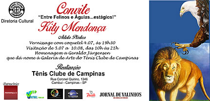 Vernissage aberto a visitação de 05/07 a 10/08 das 10h as 21h, na Galeria de Arte do Tênis Clube de Campinas.