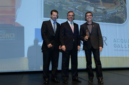 Na solenidade de entrega do Prêmio Seconci, em São Paulo, o presidente do Sinduscon-SP, José Romeu Ferraz Neto, entregou o troféu aos representantes da Patrimar - o Engenheiro de Segurança do Trabalho, Darci Vieira e o Diretor de Produção, Alexandre Lara.