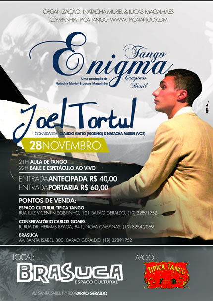 Tango Enigma Campinas Brasil é o nome do projeto dos professores Natacha Muriel e Lucas Magalhães, gabaritados e especializados na Argentina e que já rodaram meio Mundo contratados para shows de Tango. É uma oportunidade única de vê-los cantar e dançar com o acompanhamento do convidado, Joel Tortul (pianista) e Claudio Gatio (violino), que se apresentam, exclusivamente nesta oportunidade.