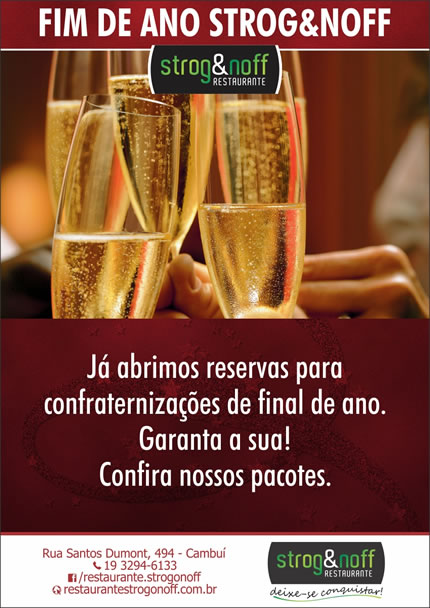 Um ano inteiro de árduo trabalho chega ao fim e pede uma comemoração daquelas. Já sabe onde vai celebrar as conquistas de 2014 e a chegada de 2015 com os colegas de trabalho ou com os amigos? No Restaurante Strog&Noff, localizado no bairro Cambuí, a expectativa é de aumento nos eventos de confraternização e, para atender à demanda, a casa oferece pacotes fechados com cardápios especiais.