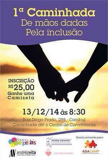 Caminhada pela inclusão, inicia no Rua Diogo Prada, 298 no Cambuí e vai até o Teatro de Arena no Centro de Convivência Cultural de Campinas. Dia 13/12/2014 as 8:30