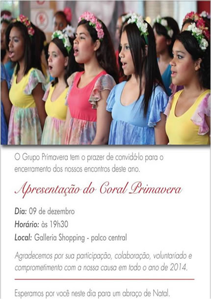 Apresentação do Coral Primavera, composto por meninas da ONG Grupo Primavera, que ocorrerá no próximo dia 9 (terça-feira), às 19h30, no Galleria Shopping, em Campinas.