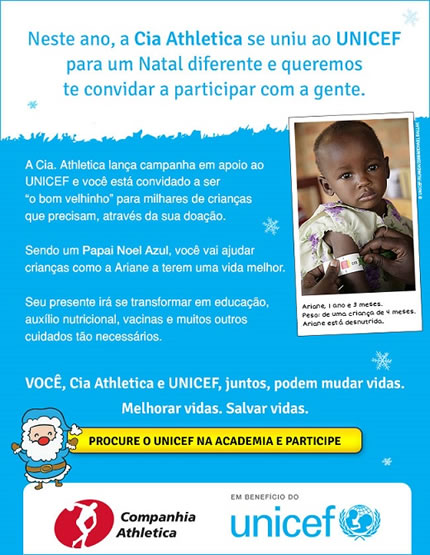 O fim de ano na Cia Athletica será marcado pela solidariedade. Até o dia 22 de dezembro, todas as 18 unidades da rede, dentre elas a de Campinas, realizará a campanha Natal Azul. Por meio dela, os alunos e colaboradores serão convidados a doar para o UNICEF (Fundo das Nações Unidas para a Infância) e os recursos arrecadados serão utilizados em iniciativas para melhoria das condições de vida de milhares de crianças e adolescentes no Brasil e no Mundo