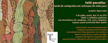 A artista Tetê Pacetta apresenta sua arte em novo suporte: echarpes de musseline de seda pura! A edição é limitada, numerada e assinada: é arte de desfilar nas ruas. "Acredito que quanto mais se convive com a arte, melhor é o mundo, pois a estética encanta e o encantamento produz bom humor e bem-estar. Ainda, a linha entre arte e design está cada vez mais tênue", diz Ligia Testa, que concebeu a mostra. A tarde de autógrafos das echarpes e bate-papo com a artista acontece em 3/julho, sexta próxima, das 15 às 19, no espaço novo do Paulo Penteado Über Stylist, à Rua Viscondessa de Campinas, 232, Nova Campinas.
