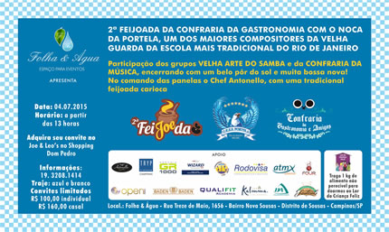 No próximo dia 4 de julho, a Confraria da Gastronomia & Amigos, promove a segunda edição da feijoada no espaço Folha & Água, em Sousas, com apoio das empresas Tryp Campinas, Buffet Antonello, Agência GR1000, Wizard, Jovem Pan, Rodovisa Transportes, Open News, Baden Baden, Qualifit Academia, Kalmma Spa, JJA Contábil e Polimaia.