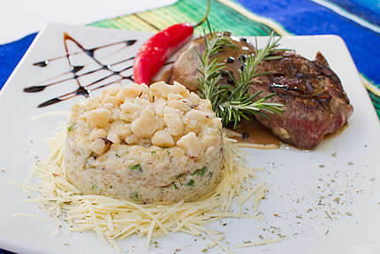 El Tambo - Entrada: tabule sete grãos. Principal: mignon ao poivre guarnecido com risoto de quinoa com castanha do Pará. Sobremesa: Sagú de hortelã refrescante. www.eltambo.com.br 19.21215139.