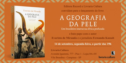 Hoje dia 14 de setembro, acontecerá, na Livraria Cultura do Shopping Iguatemi, o lançamento nacional do livro "A Geografia da Pele", do escritor e pesquisador Dr. Evaristo Eduardo de Miranda. O lançamento é uma parceria da livraria Cultura com a Editora Record. O evento terá início a partir das 19h, com um bate-papo entre o autor e o jornalista Fernando Kassab, no piso térreo da livraria.