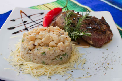 Principal: mignon ao poivre guarnecido com risoto de quinoa com castanha