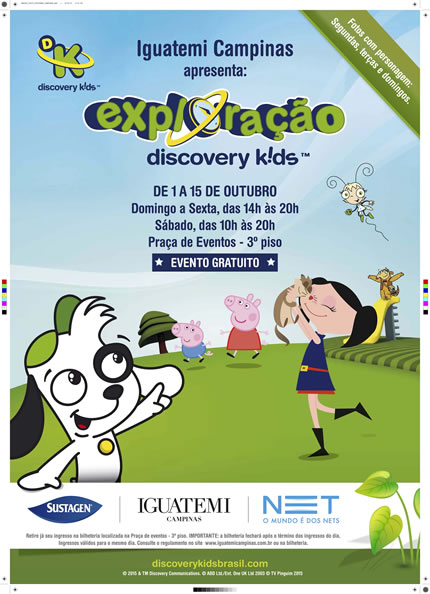 A edição deste ano do evento itinerante EXPLORAÇÃO DISCOVERY KIDS chega no dia 1º de outubro a Campinas. Até o dia 15 de outubro, o Shopping Iguatemi Campinas abriga o circuito com seis áreas inspiradas nos personagens da programação do canal, uma delas dedicada à série "Festa Hi-5!". As atividades incentivam o interesse das crianças pelo conhecimento de forma criativa e divertida.