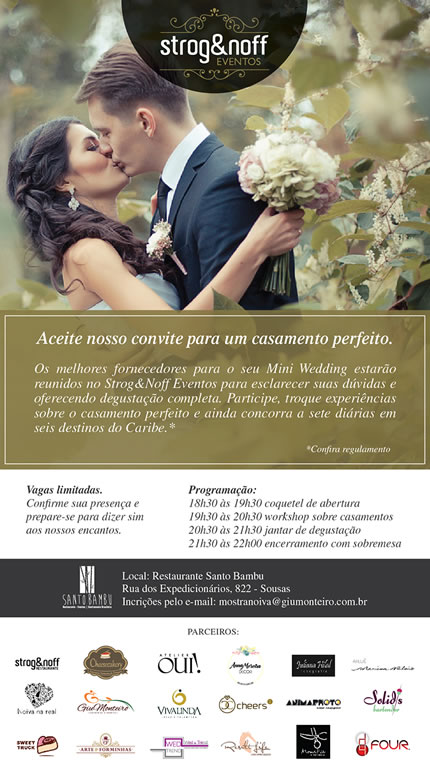 No próximo dia 9 de março, quarta-feira, à partir das 18h30, o Santo Bambu Eventos inaugura seu espaço, com degustação do buffet Strog&Noff Eventos. Será um dia especial com os melhores ingredientes para que o seu mini wedding seja inesquecível! Além disso, terá palestra com o tema Mini Wedding - ele veio para ficar! Como organizar o seu? com dicas para não errar no planejamento do dia do casamento em um bate papo com a cerimonial Giu Monteiro e a blogueira Janaina Nascimento, do blog Noiva Na Real. As Noivas ainda serão presenteadas com o sorteio de uma viagem para 2 pessoas para o Caribe.
