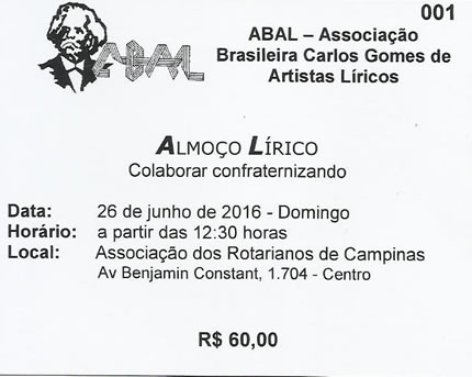 O ALMOÇO LÍRICO DA ABAL será realizado no dia 26 de Junho de 2016 a partir