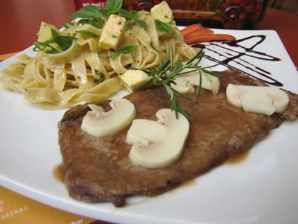 Principal: Mignon ao molho roti e risoto de castanha da pará, Salmão ao molho de Champagne e guizado de quinua com legumes ou Paillard de Mignon com Fettucine.
