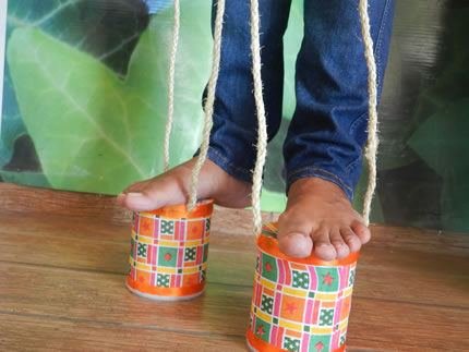 Em cedro, foram produzidos o pião comum e o pião mágico, a corda de pular com manejo em tecido estampado e o pé de lata, que desafia a garotada a andar se equilibrando em latas recicladas, uma brincadeira muito comum entre os meninos na década 50. Um presente também para os pais e avós que voltam à infância.