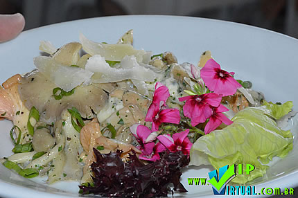 MENU - Entrada: Torre de Melanzane gratinada OU Insalata di Pollo al Sale Alle Erbe e mix de verdes (Salada de frango ao Sal de Ervas Finas e Verdes). Prato principal: Costine de maiale ala brace in letto de polenta italiana e glacê do assado (costelinha de porco assada em cama de polenta em seu próprio sugo) OU Ravioli di Noci, Ricota e Fichi in Crema Velutata (Ravioli de nozes, ricota e figos em creme aveludado). Sobremesa: Verrine di Coiccolato Bianco com Cioccolato Nero e Nocciola (Verrine de chocolate branco com raspas de chocolate negro e avelã OU Panacota em Calda de Figo.