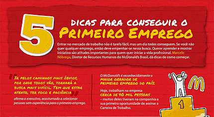 “Ir pelos caminhos mais óbvios, por onde todos vão, tornará a busca mais difícil. Tem que estar atento, ter foco e paciência”, afirma o executivo, acostumado a selecionar pessoas sem experiência para o primeiro emprego. O McDonald’s é reconhecidamente o maior gerador de primeiro emprego do país. Hoje, trabalham na empresa cerca de 40 mil pessoas – muitos deles tiveram na companhia a sua primeira oportunidade de assinar a Carteira de Trabalho.
