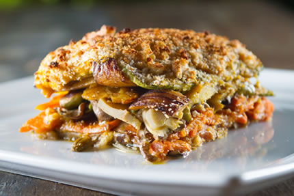 Para quem prefere um prato vegetariano, o Chef Ricardo Barreira preparou uma Lasanha Vegana, que leva camadas de berinjela, champignon, cenoura e abóbora Itália grelhada. Estas camadas são intercaladas com purê de abóbora cobitiá, pistache, tomate assado, com um leve perfume de manjericão.