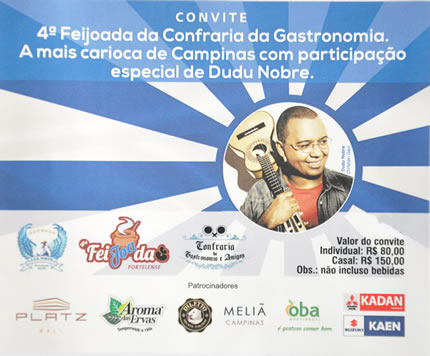 Liberado os convites para a Feijoada da Confraria da Gastronomia, que será realizada no próximo dia 08/07/2017 à partir das 12h, no Espaço Folha & Água (Rua Treze de Maio, 1656) e que irá contar com a participação especial de Dudu Nobre.