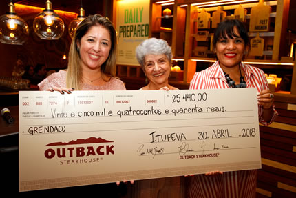 A diretora-presidente da instituição, Verci Andrêo Bútalo, recebeu o cheque simbólico e agradeceu a iniciativa do Outback. O valor arrecadado será destinado à manutenção do Hospital da Criança – 24 horas, que oferece tratamento integral, com Centro Cirúrgico, UTI e Internação, a pacientes com câncer.
