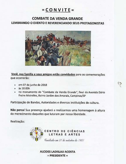" Compreender o combate de Venda Grande, portanto, é compreender a grandiosidade dos homens campineiros, é olhar para o passado e para o presente e ver a envergadura de nossos cidadãos, sua altivez, sua visão libertária e sua ação no sentido da construção de uma sociedade livre e produtiva, sentimentos que nunca nos fizeram arrefecer diante de tantas ações retrógadas. O progresso de hoje é semente plantada por homens honrados como Rafael Tobias de Aguiar, Boaventura do Amaral e Teófilo Ottoni. O liberalismo está no coração de todos os paulistas e mineiros que, juntos, até hoje, lutam pelo engrandecimento da Pátria brasileira. "