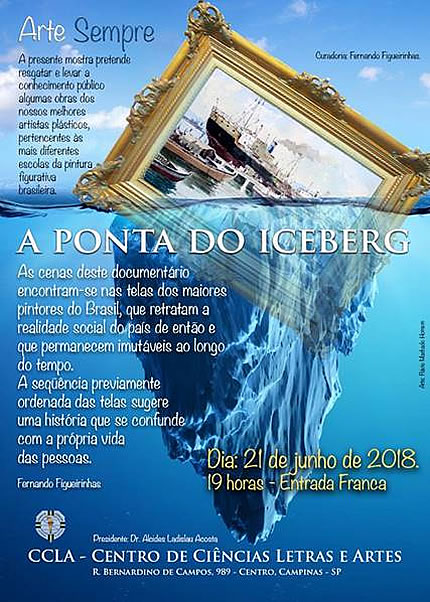 Vinte obras em tela de alguns dos mais significativos pintores figurativos nacionais serão exibidas na galeria de artes do Centro de Ciências, Letras e Artes (rua Bernardino de Campos, 989, Centro, tel. 3231-2567). O vernissage vai acontecer dia 21/06, quinta-feira, às 19 horas, e a mostra ficará aberta até 06 de julho. O público em geral poderá apreciar os trabalhos e conhecer a biografia dos pintores, além de adquiri-los. Parte da renda reverterá em favor das atividades artísticas do CCLA. Os consagrados pintores de Campinas, Egas Francisco e Marcos Garcia, enviaram um de seus quadros para exibição nessa mostra. Como parte da programação de abertura será projetado o curta “A ponta do Iceberg”, documentário de arte, produzido por Fernando Figueirinhas, e que focaliza os pintores com obras incluídas. Completando o evento, os tenores Vicente Montero e João Gabriel Bertolini, da ABAL Campinas, tendo o acompanhamento do pianista José Francisco da Costa, apresentarão um repertório de canções de amor, de variados compositores nacionais e internacionais.