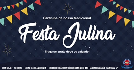 A tradicional Festa Julina do Clube Andorinha, em Campinas, será realizada no 26 de Julho à partir das 14 horas. Com entrada gratuita, o evento, destinado a toda família, contará com dezenas de barracas de comidas típicas, além de duas bandas de música, bingo e danças.