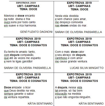 O Espaço das Artes do Ciesp-Campinas apresenta em abril a exposição ExpoTrova 2019, com o tema ‘Trova Doce’. Dessa forma todas as trovas utilizam a palavra doce ou seus cognatos. A Trova é a primeira expressão de poesia rimada da humanidade e foi trazida ao Brasil pelos portugueses.
