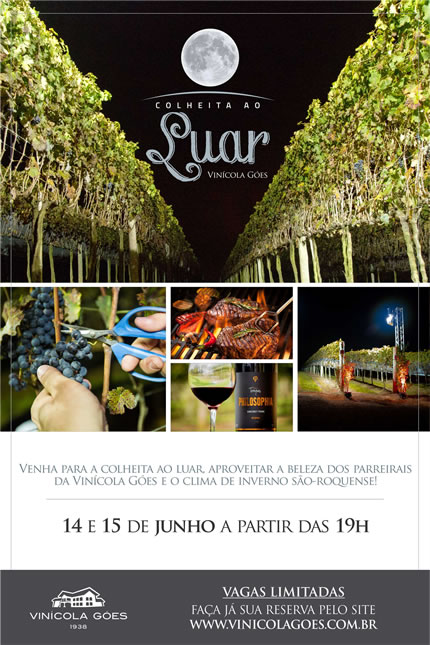 “Além de ser um momento lúdico inesquecível para todos, de proximidade da Família Vinícola Góes com seus visitantes, na Colheita ao Luar nós podemos apresentar in loco os passos concretos da evolução da vitivinicultura paulista, em especial a virtuosa safra de outono/inverno de uvas finas. Diversão, Conhecimento, Friozinho do Campo, Gastronomia e muitas taças de bons vinhos, tudo esperando ansiosamente pelos nossos amigos clientes”, comemora Luciano Lopreto, diretor comercial da Vinícola Góes.